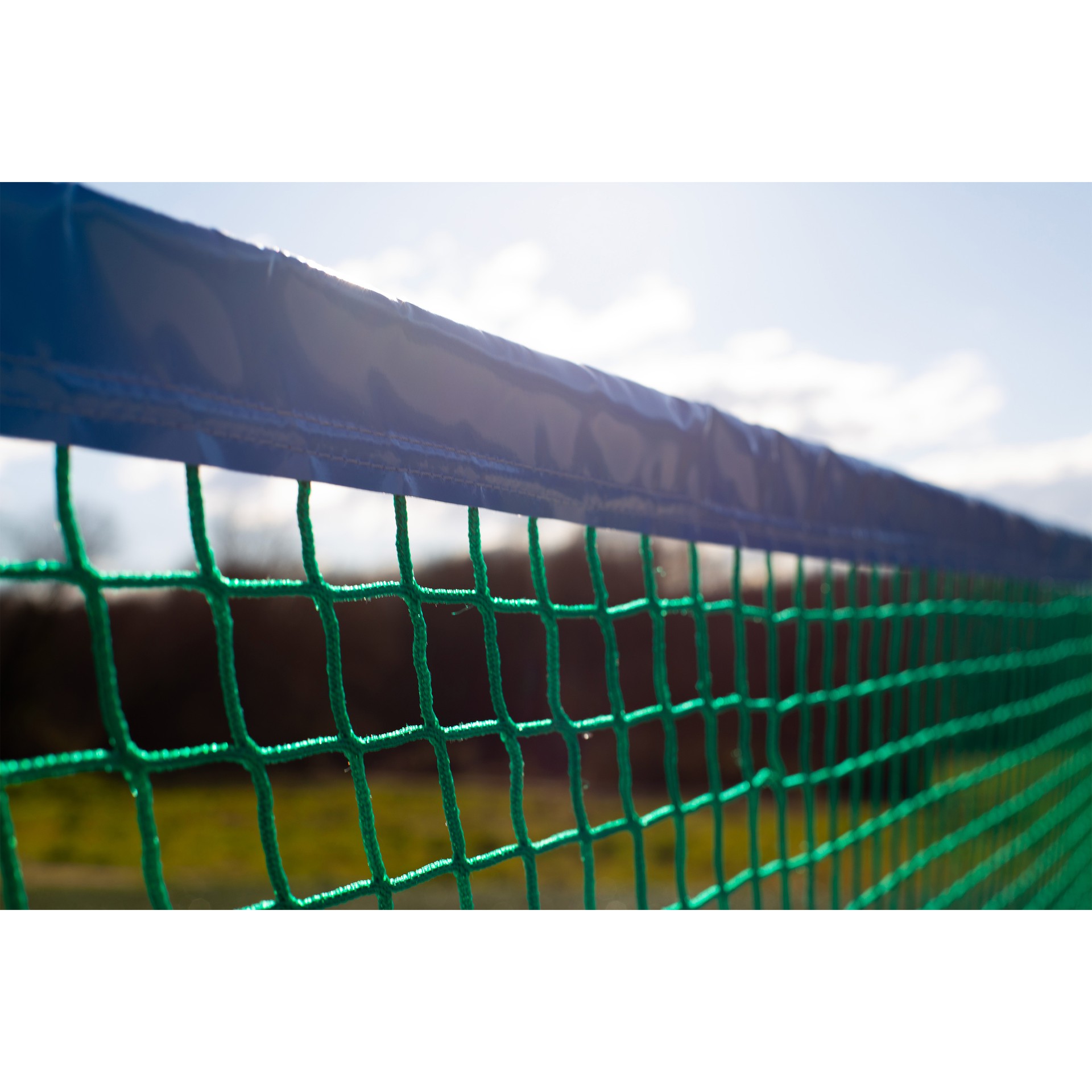 2,3mm Polipropileno en verde, malla de 45x45mm con cinta azul por todo el perímetro (la superior de 5cm a cada lado y la de los laterales + inferior de 3cm cada lado), con cuerda . Medidas 8,55×1,0mts